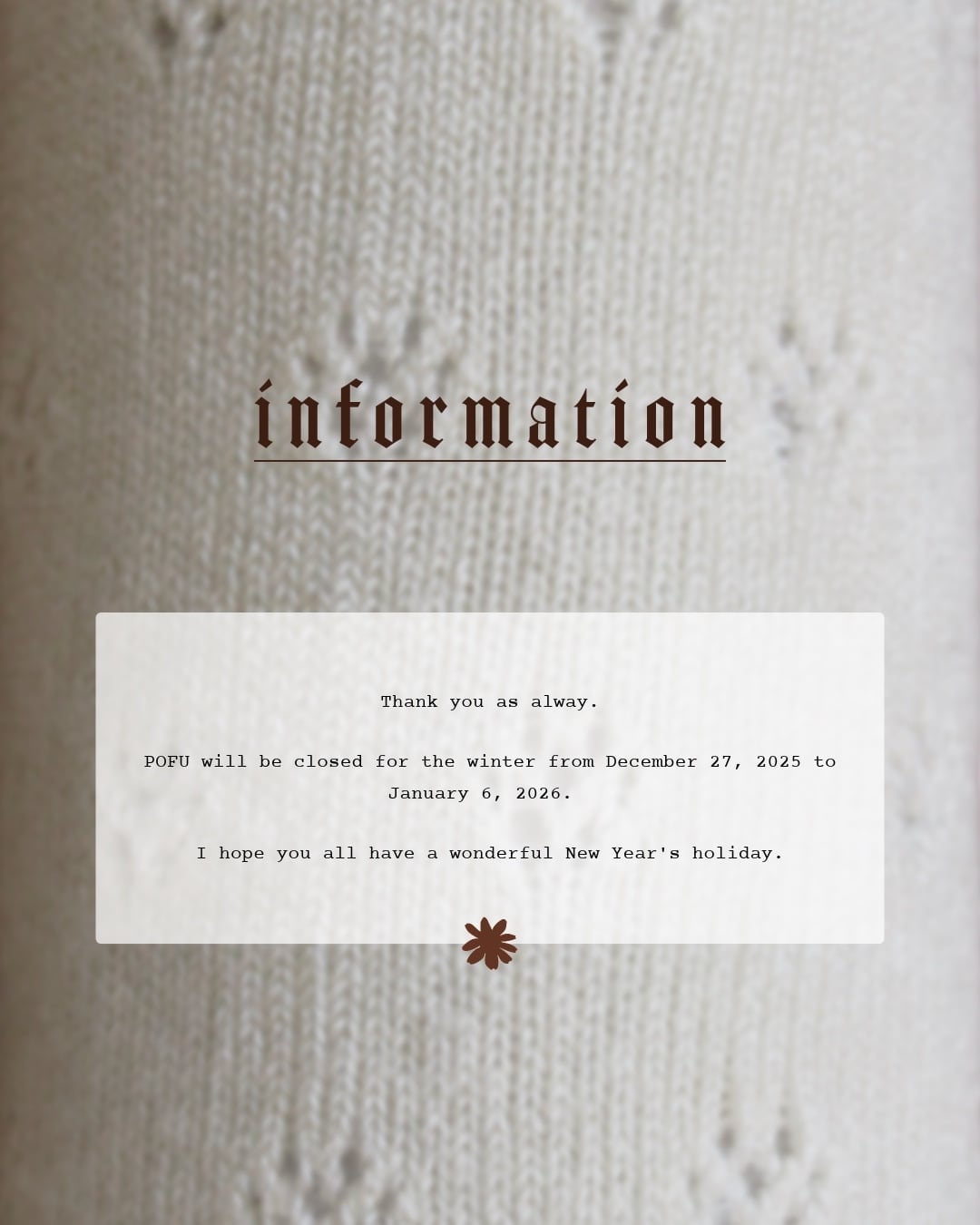 【 ONLINE SHOP 】この度も沢山のご注文を誠にありがとうございました。アクセス数もとても多くいただき大変嬉しい限りです…涙 ご予約いただいた商品は心を込めてお作りさせていただきます。楽しみにお待ちいただけましたら幸いです。 2025/12/27~2026/1/6まで冬季休業をいただきます。引き続きオンラインショップはご覧いただけますが、お問い合わせ対応は7日以降より再開させていただきます。年始SALE スケジュールは追ってお知らせ致します。皆様にとって素敵な年末年始となりますように。