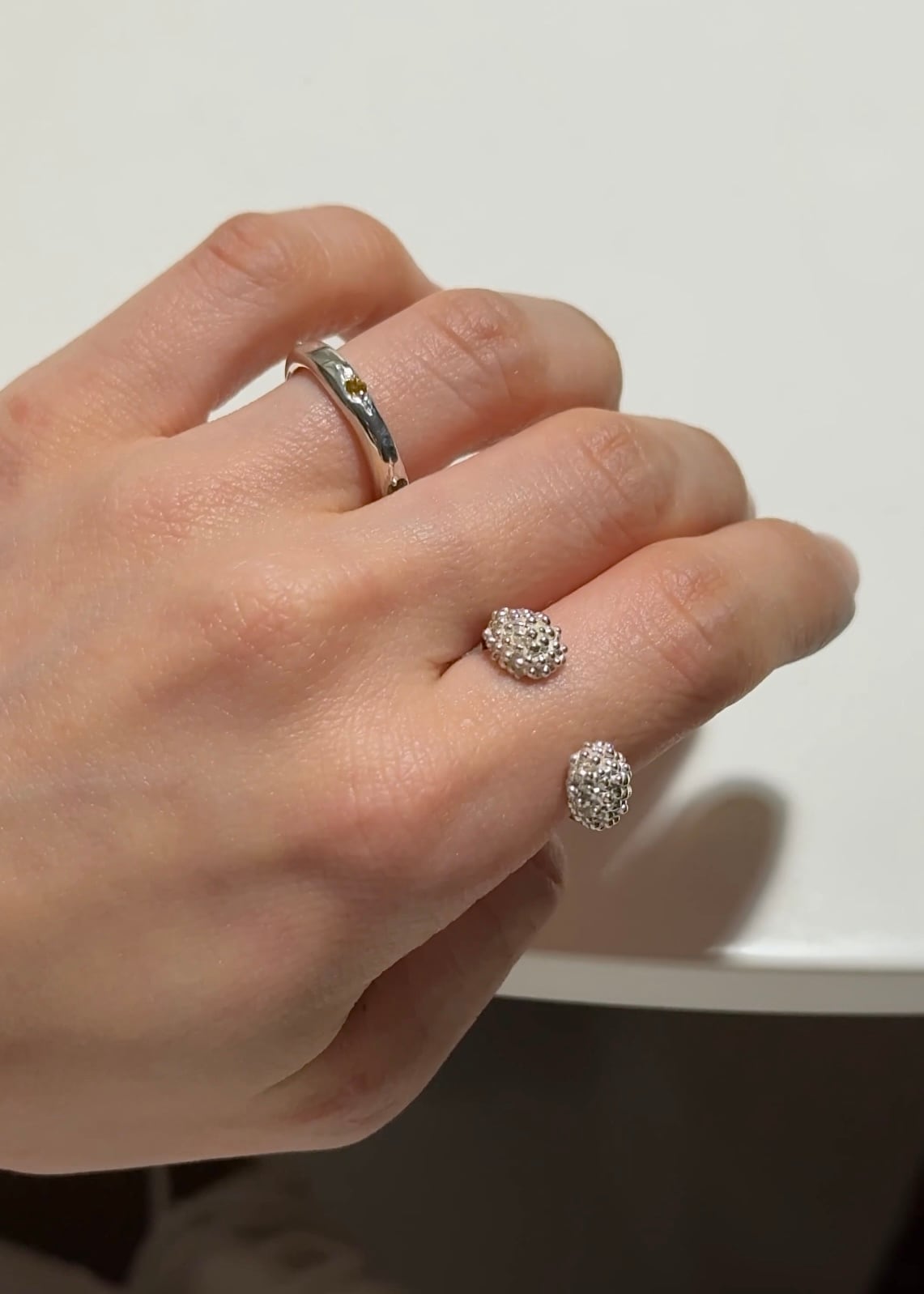 ニュアンスのある緩やかなボディに3種類の小さな石を留めたリング。