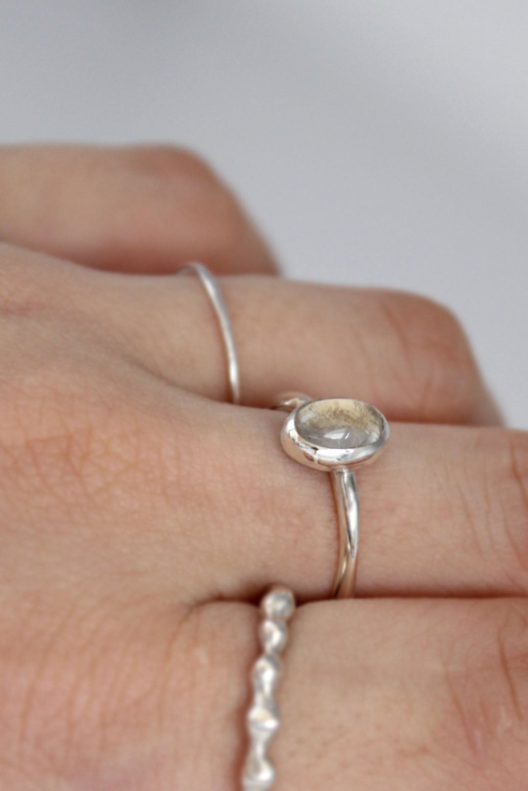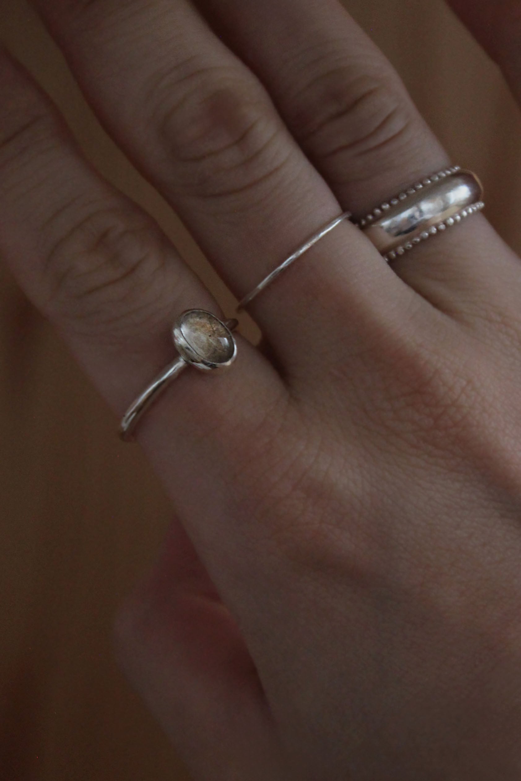 melt ring のようにハンドクラフト感のあるとろみのあるボディに仕上げているので、とても指馴染みが良く、幅広の tiny dots ring や flora ring との相性も良いです。
