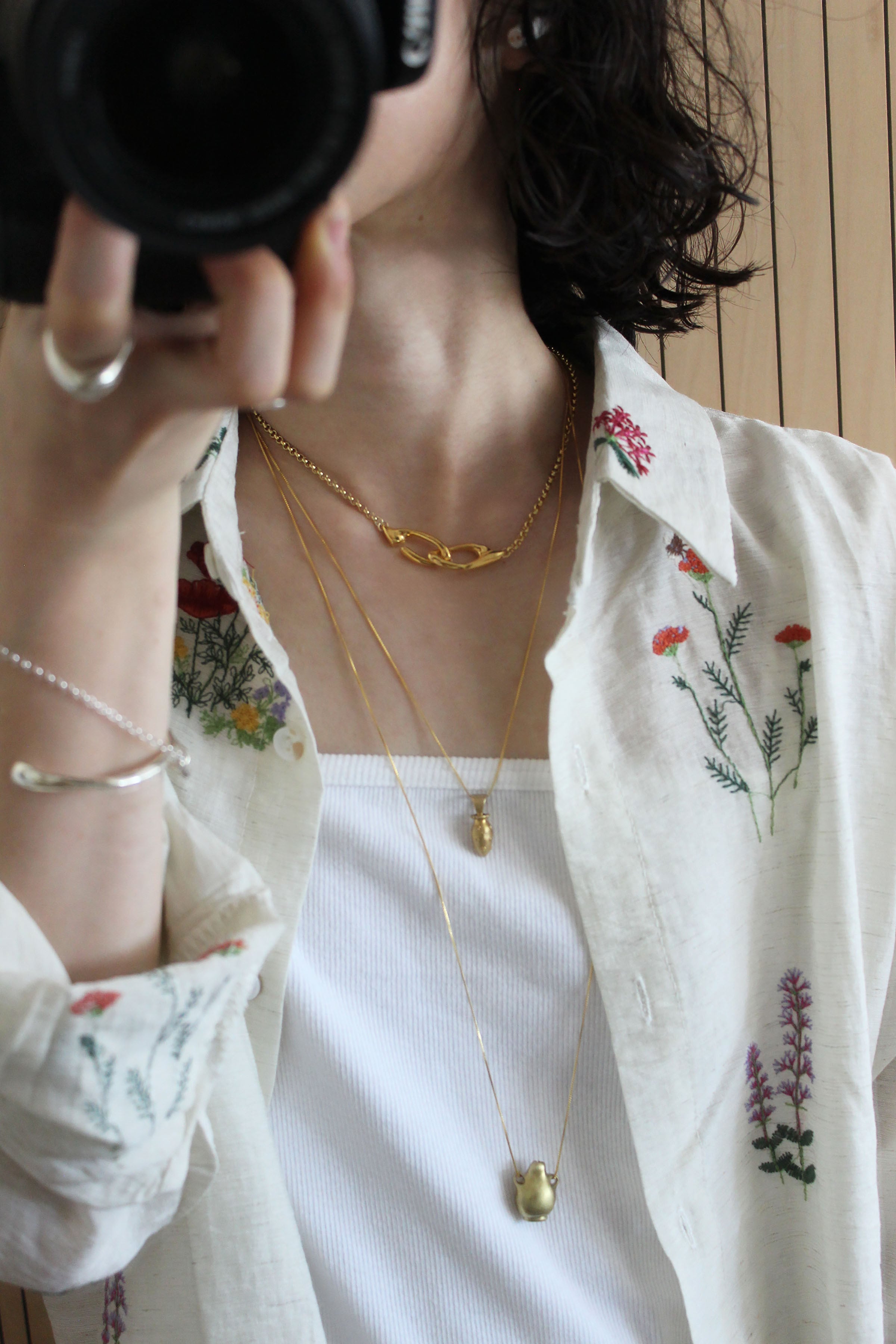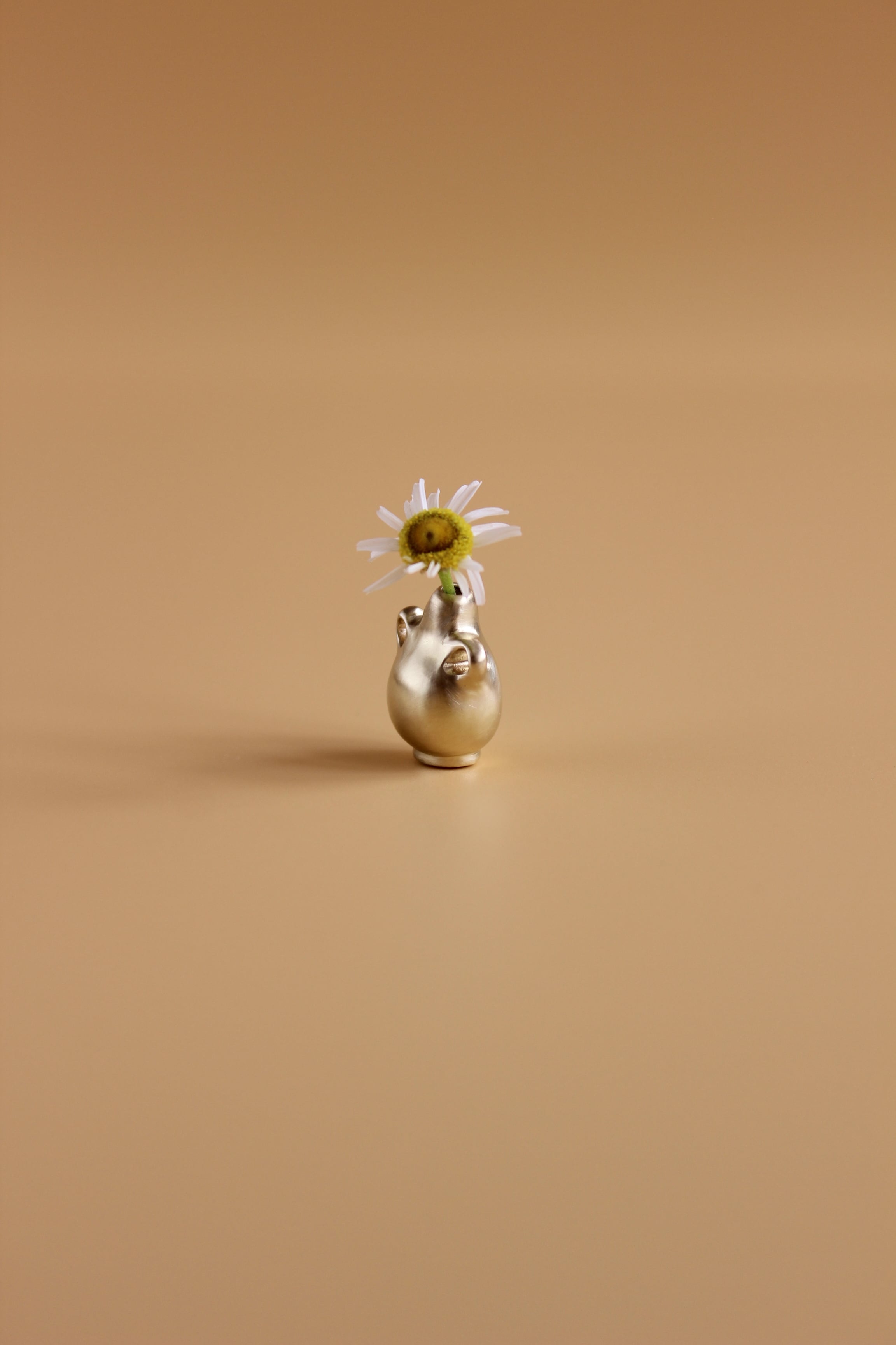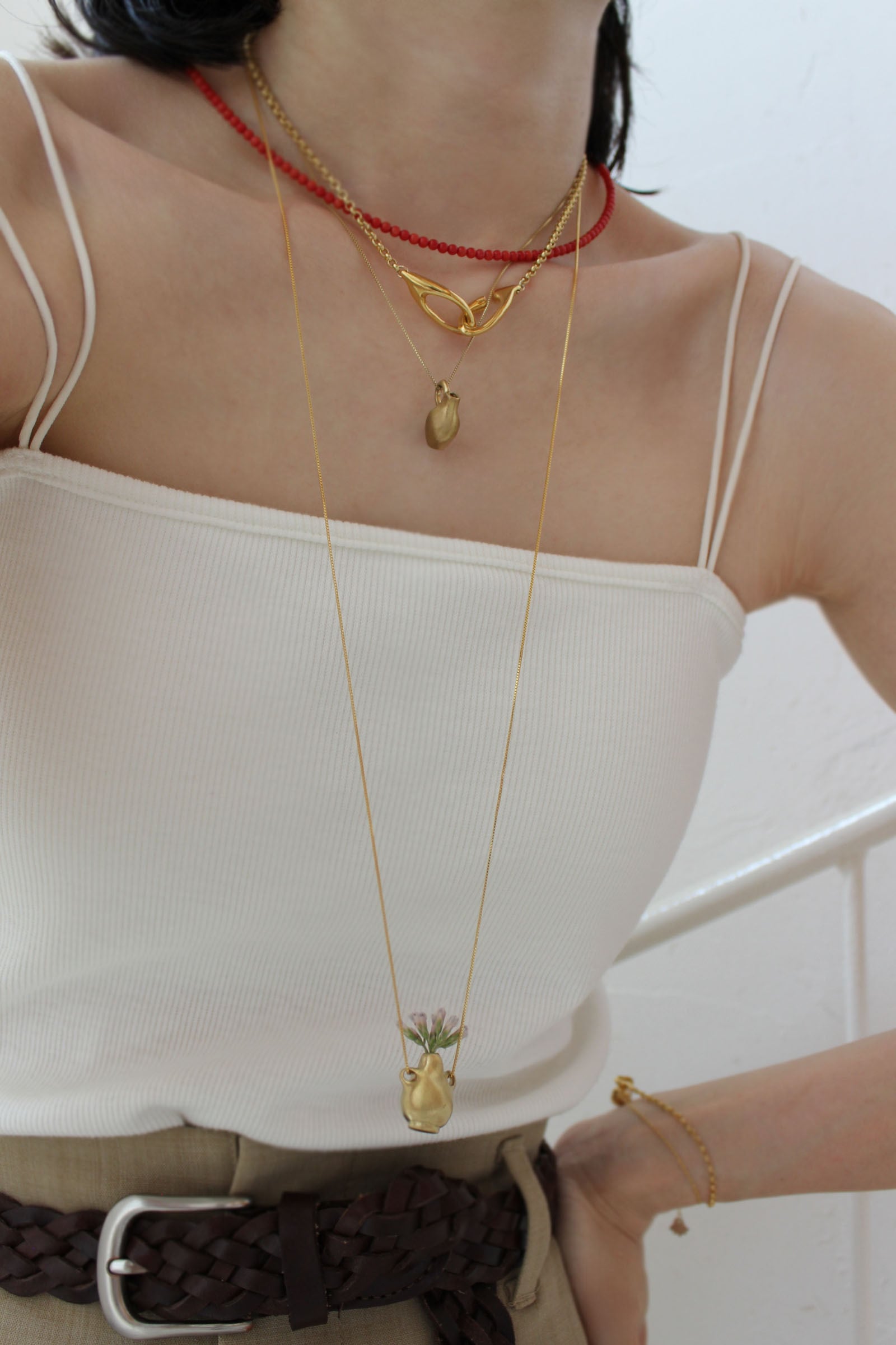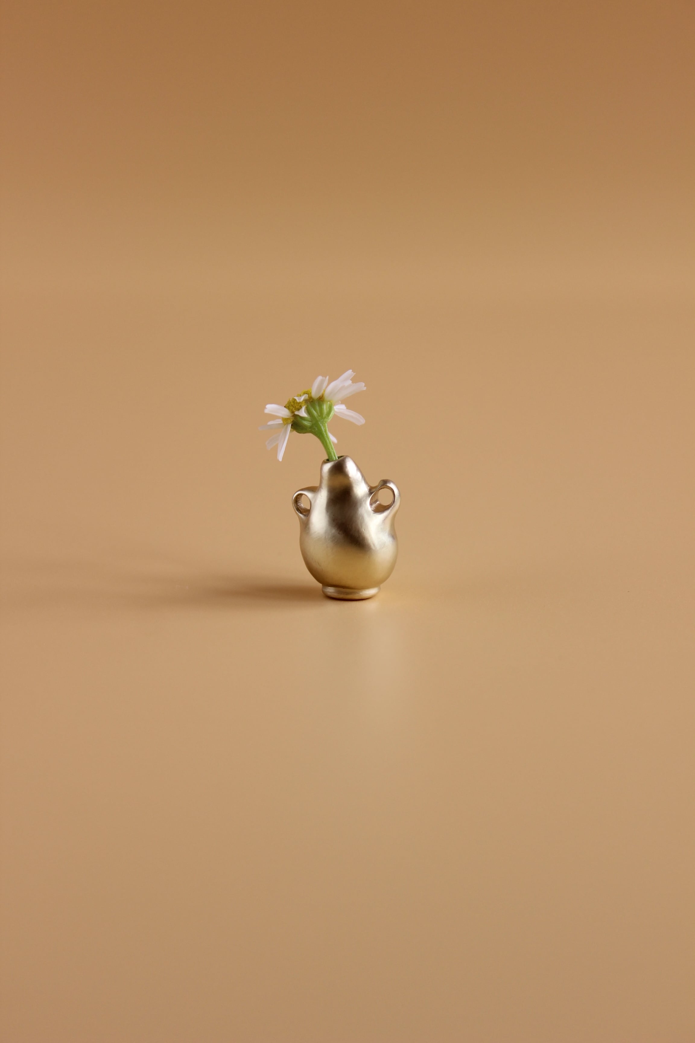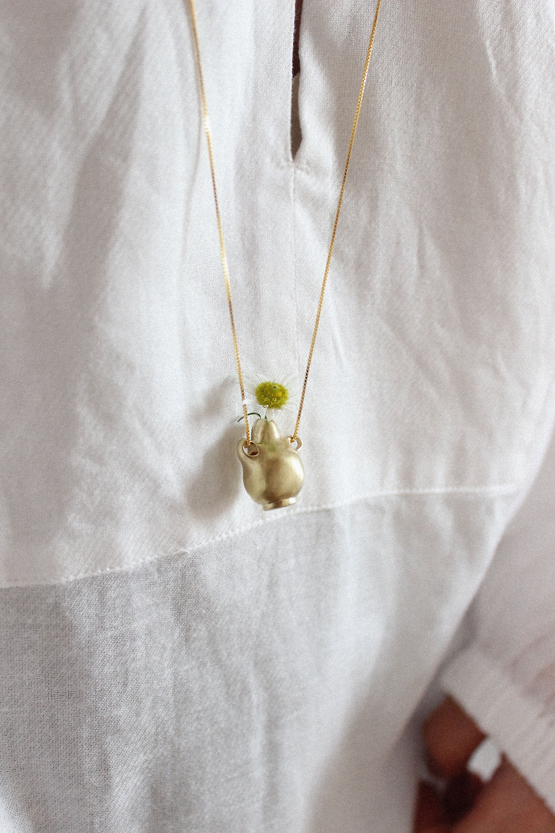 そんな背景の中で今回の Vase pendant シリーズは誕生しました。肩肘を張らず、深呼吸しながら、ふと笑みが溢れてしまうような遊び心もプラスして。実際に小さな草花を生けられるので身につけない時にはミニオブジェとしてお楽しみいただけます。