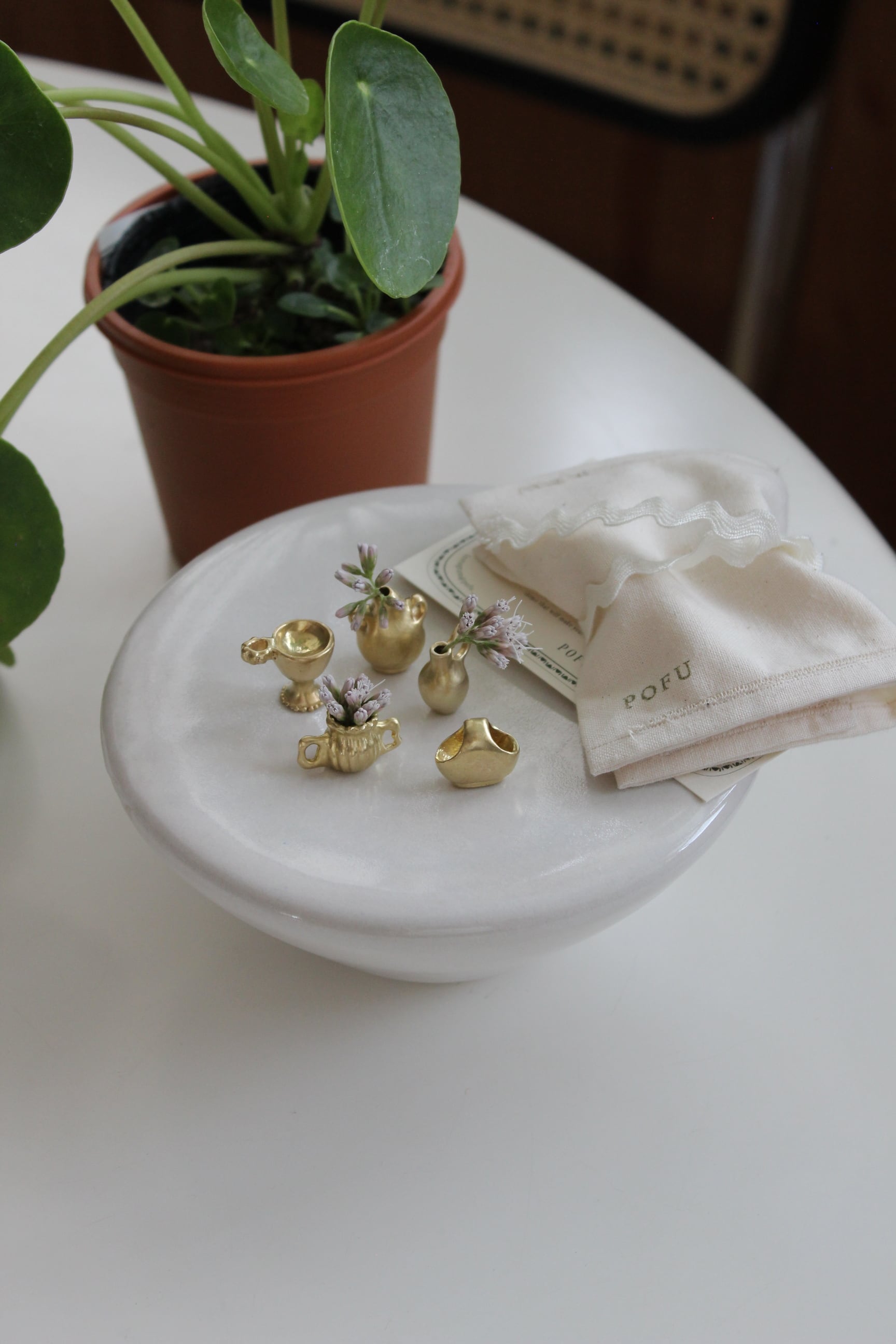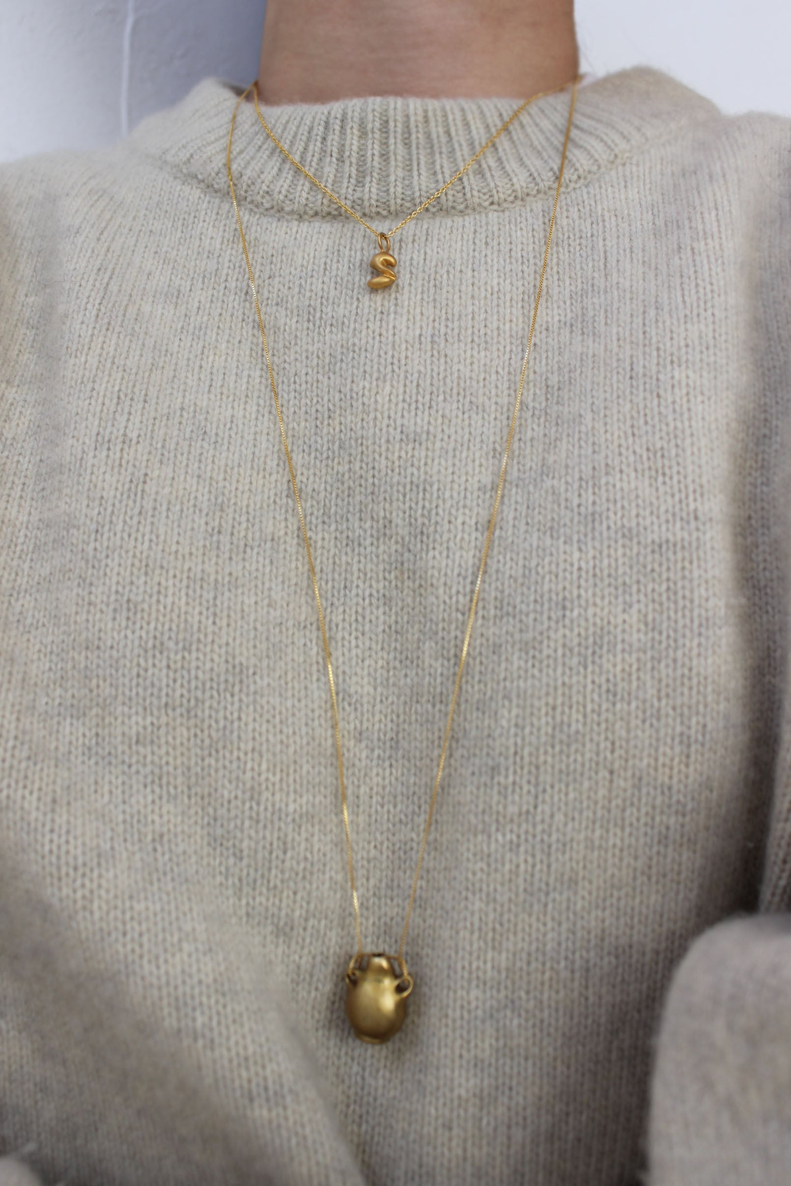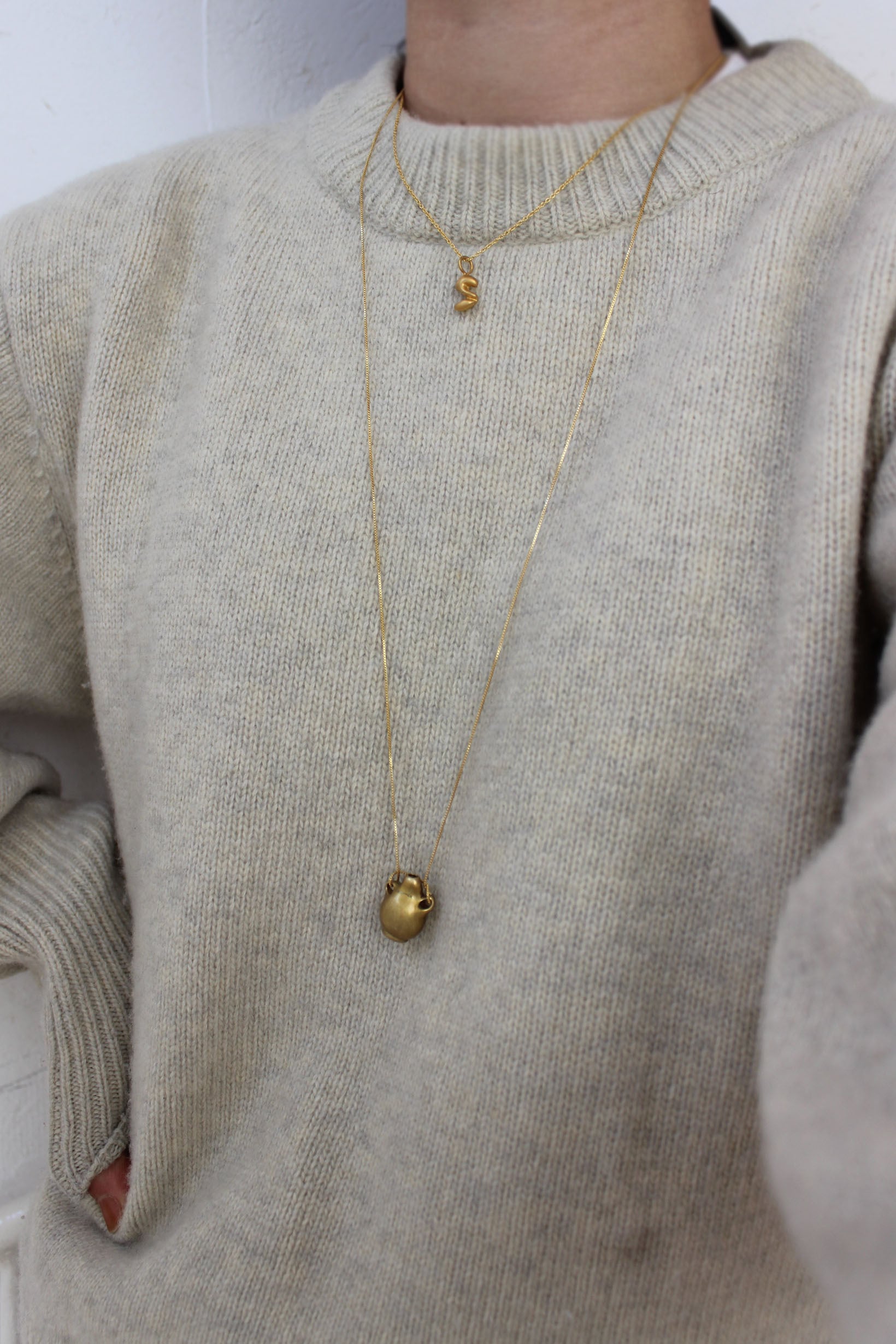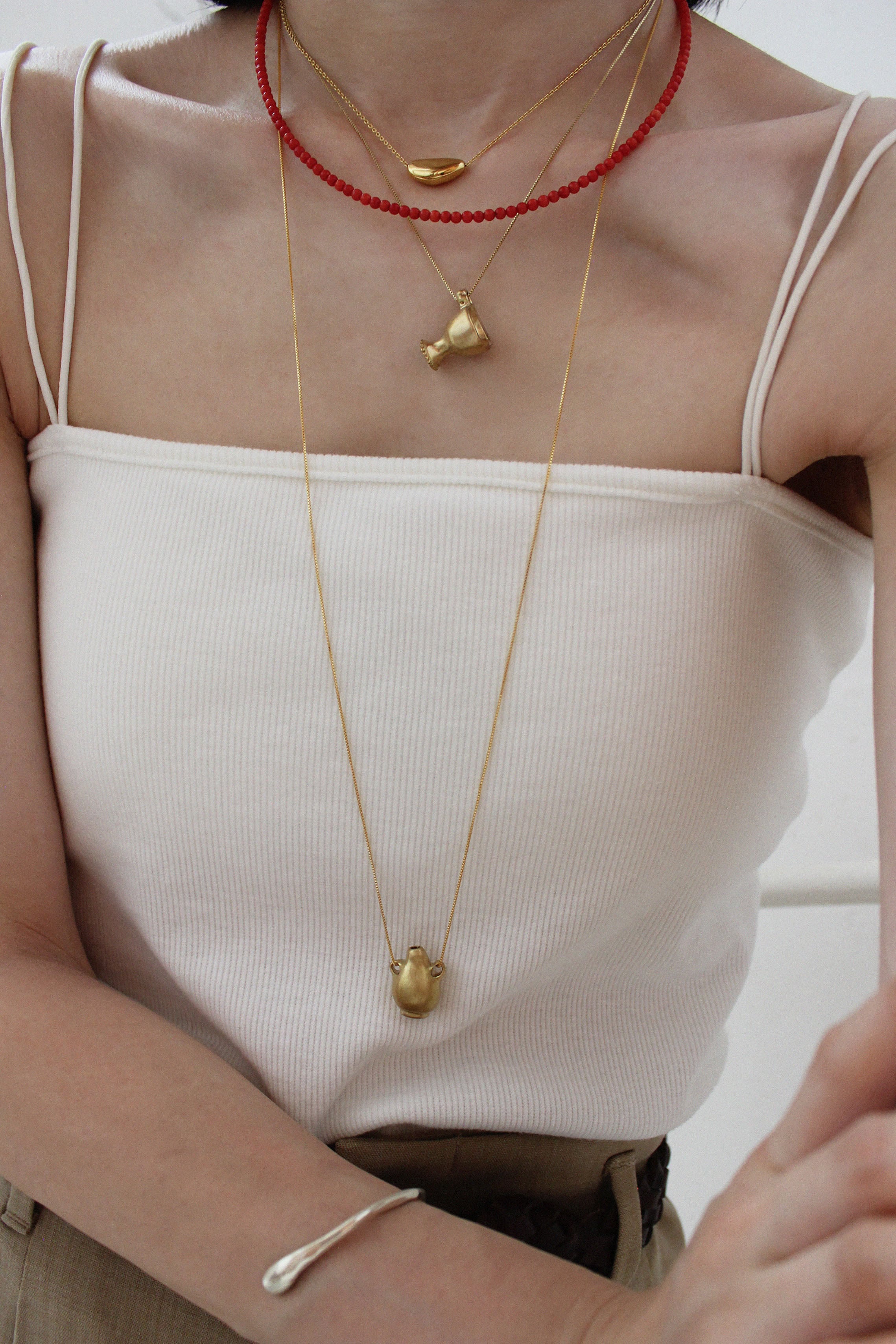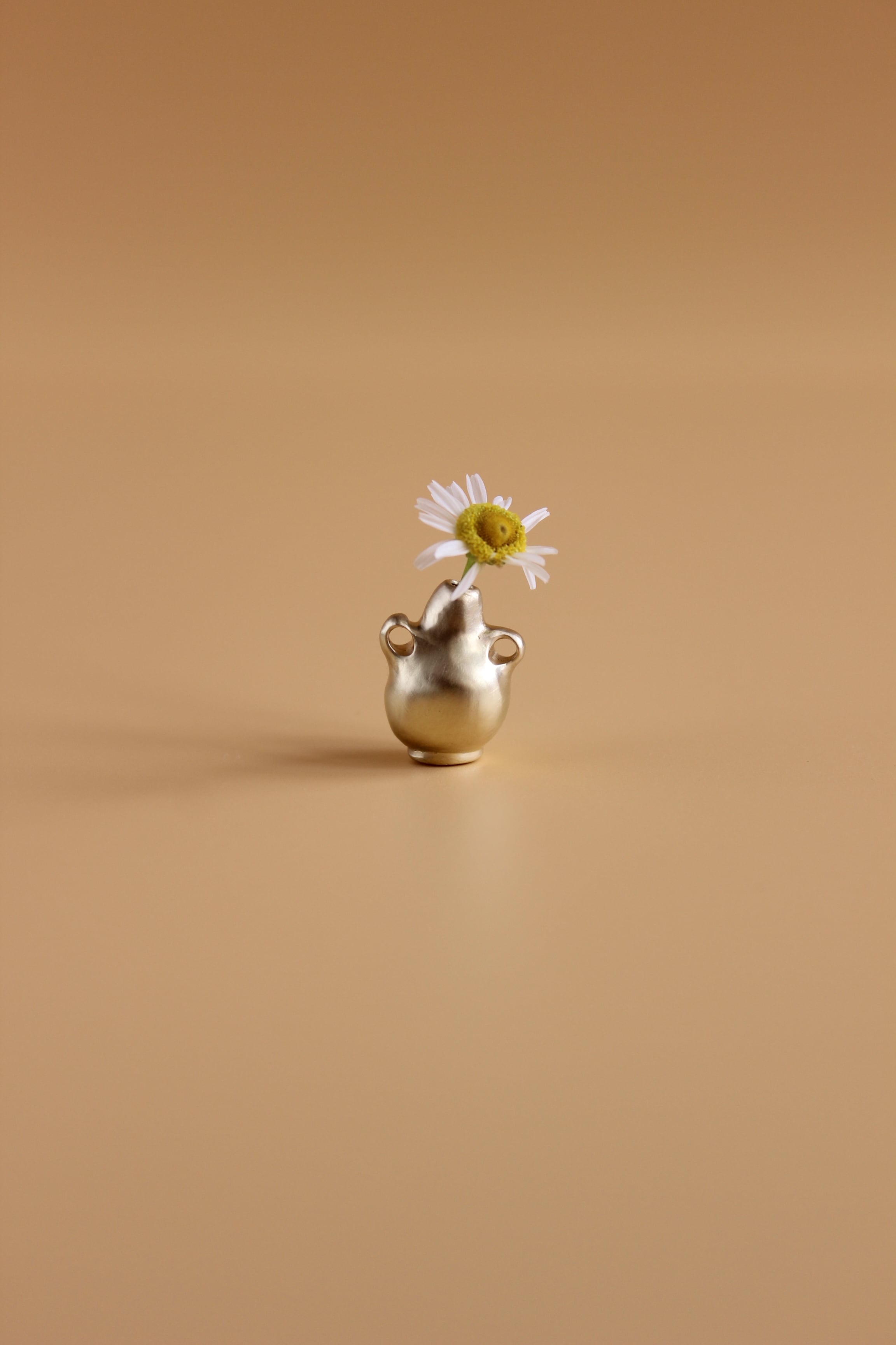そんな背景の中で今回の Vase pendant シリーズは誕生しました。肩肘を張らず、深呼吸しながら、ふと笑みが溢れてしまうような遊び心もプラスして。実際に小さな草花を生けられるので身につけない時にはミニオブジェとしてお楽しみいただけます。