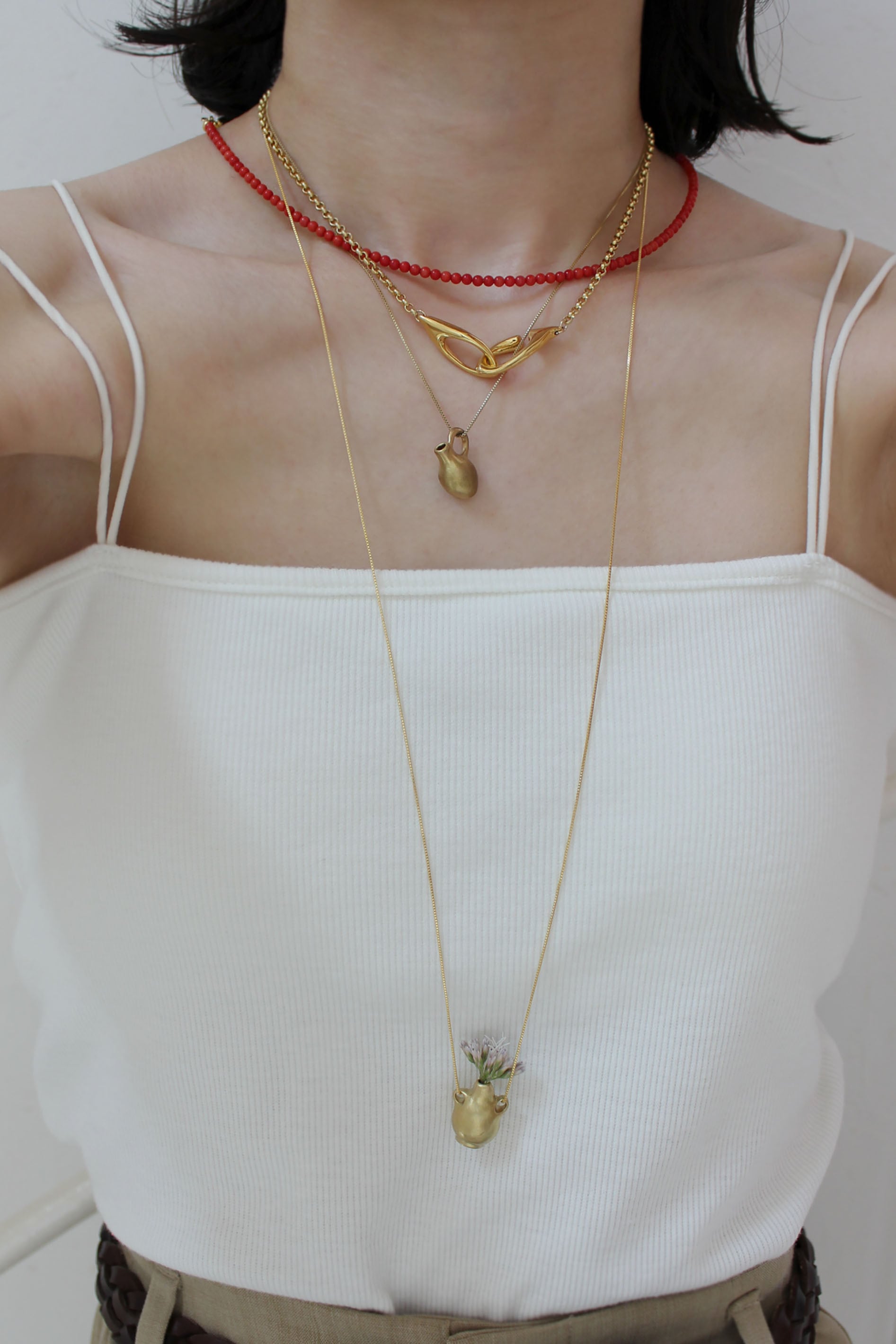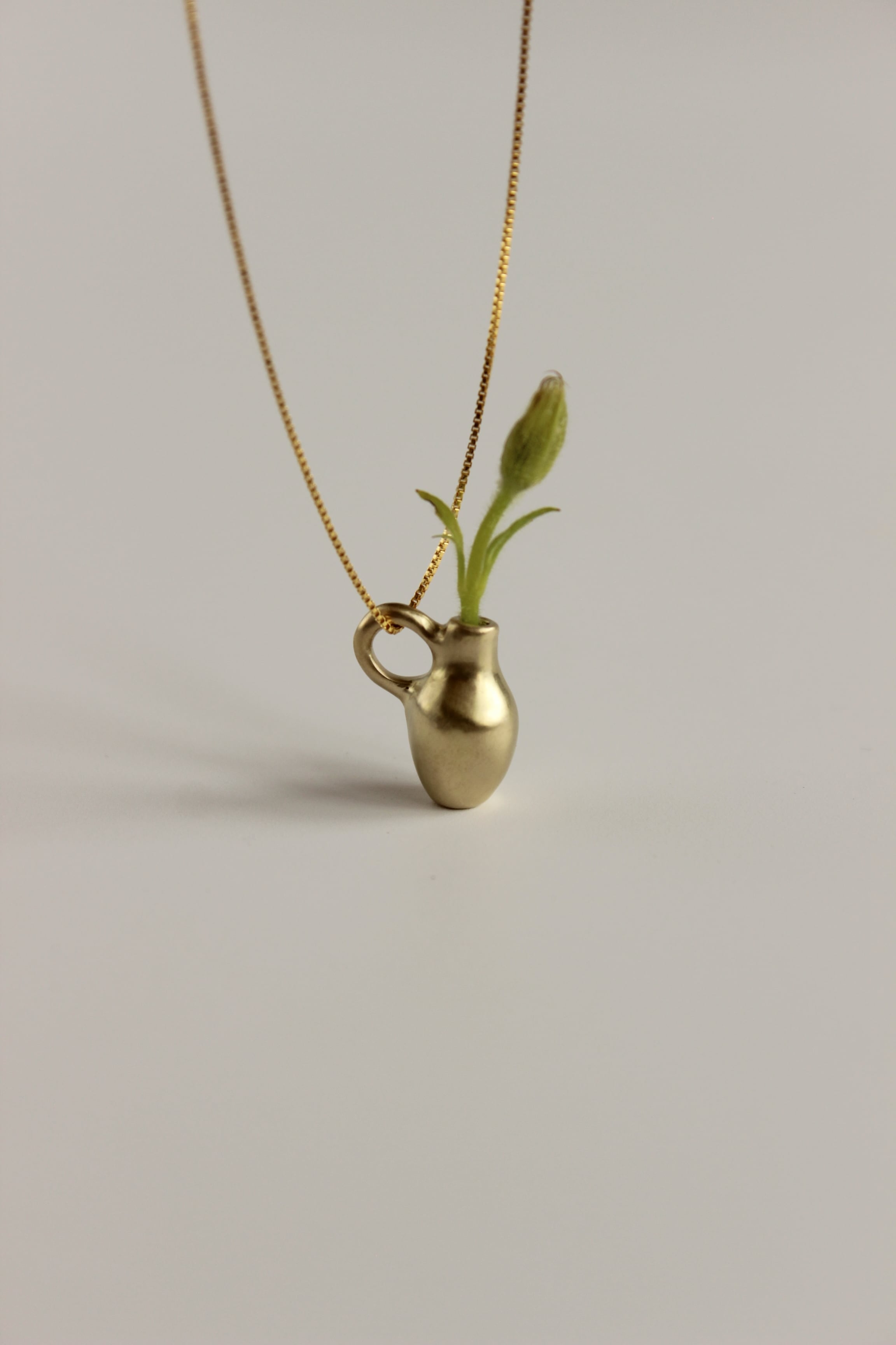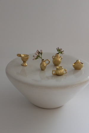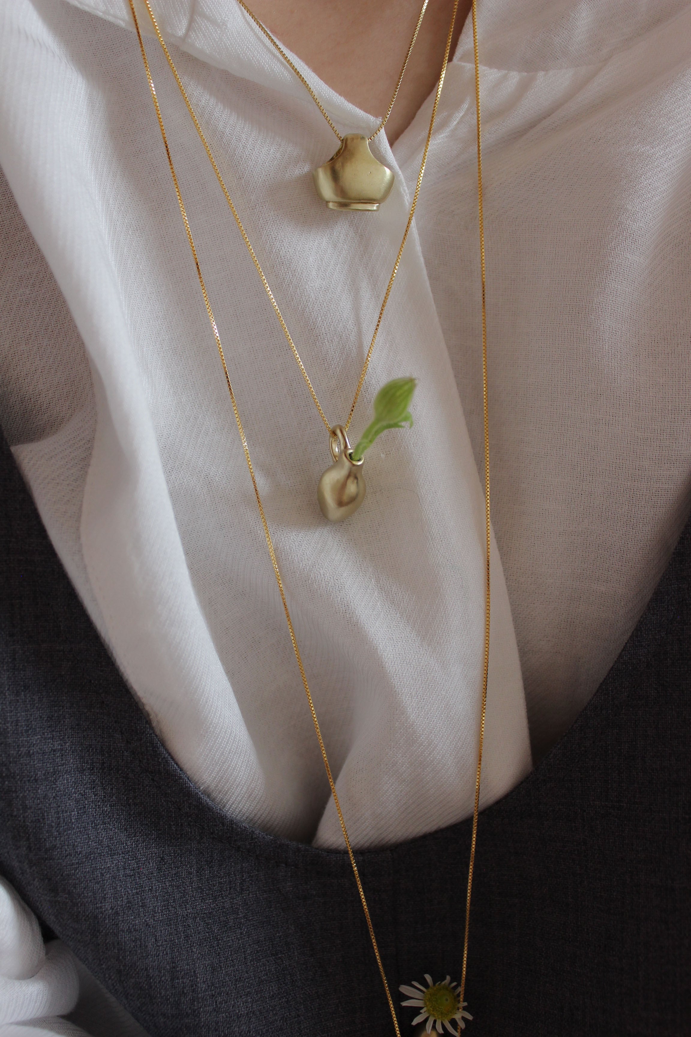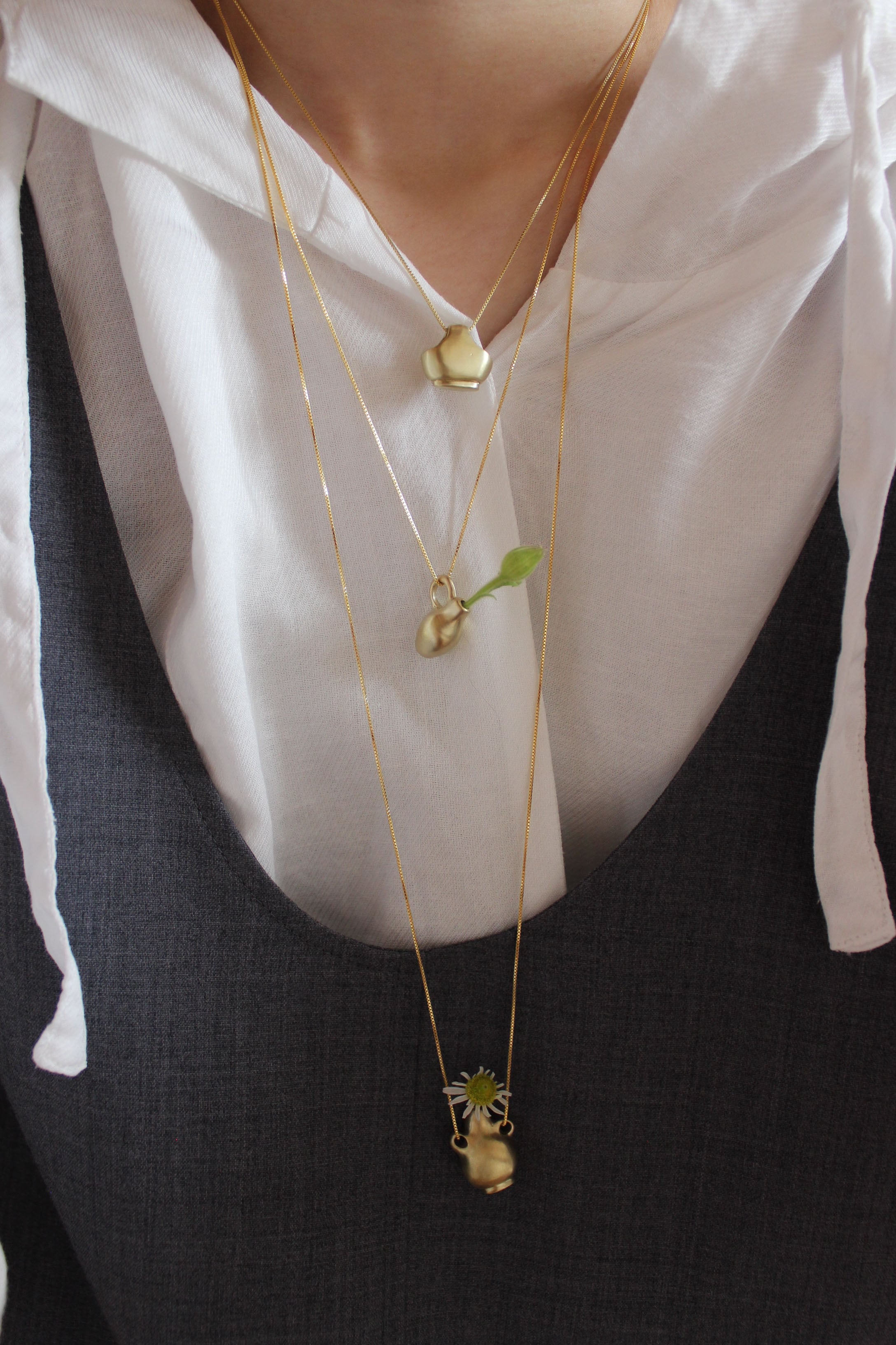 そんな背景の中で今回の Vase pendant シリーズは誕生しました。肩肘を張らず、深呼吸しながら、ふと笑みが溢れてしまうような遊び心もプラスして。実際に小さな草花を生けられるので身につけない時にはミニオブジェとしてお楽しみいただけます。
