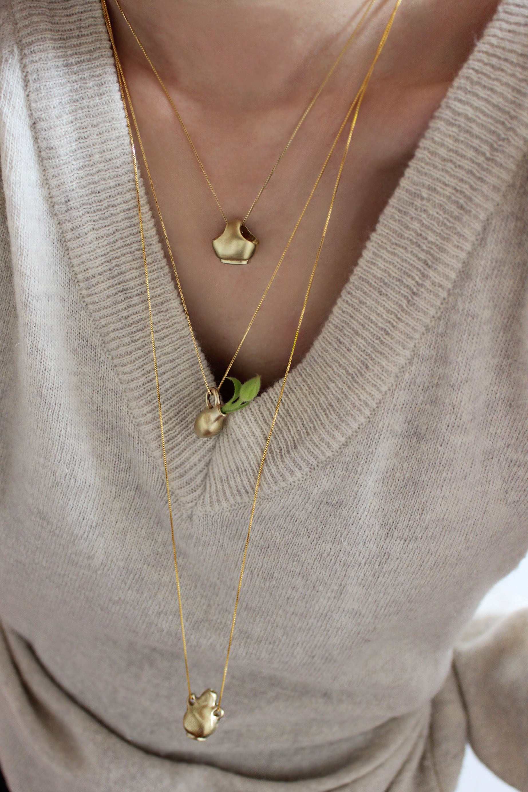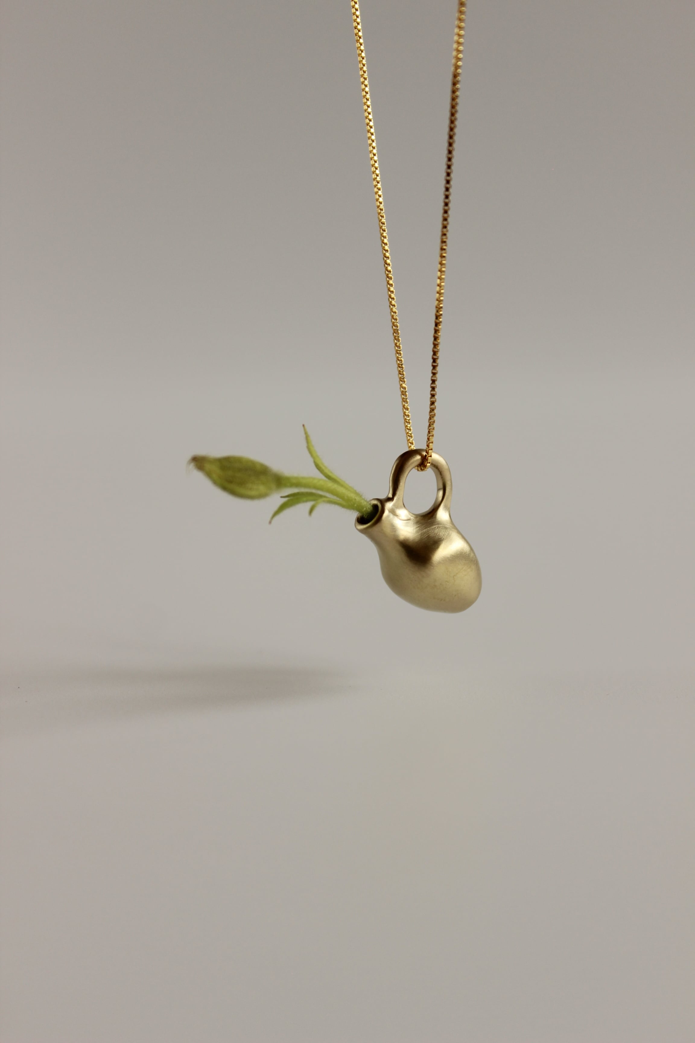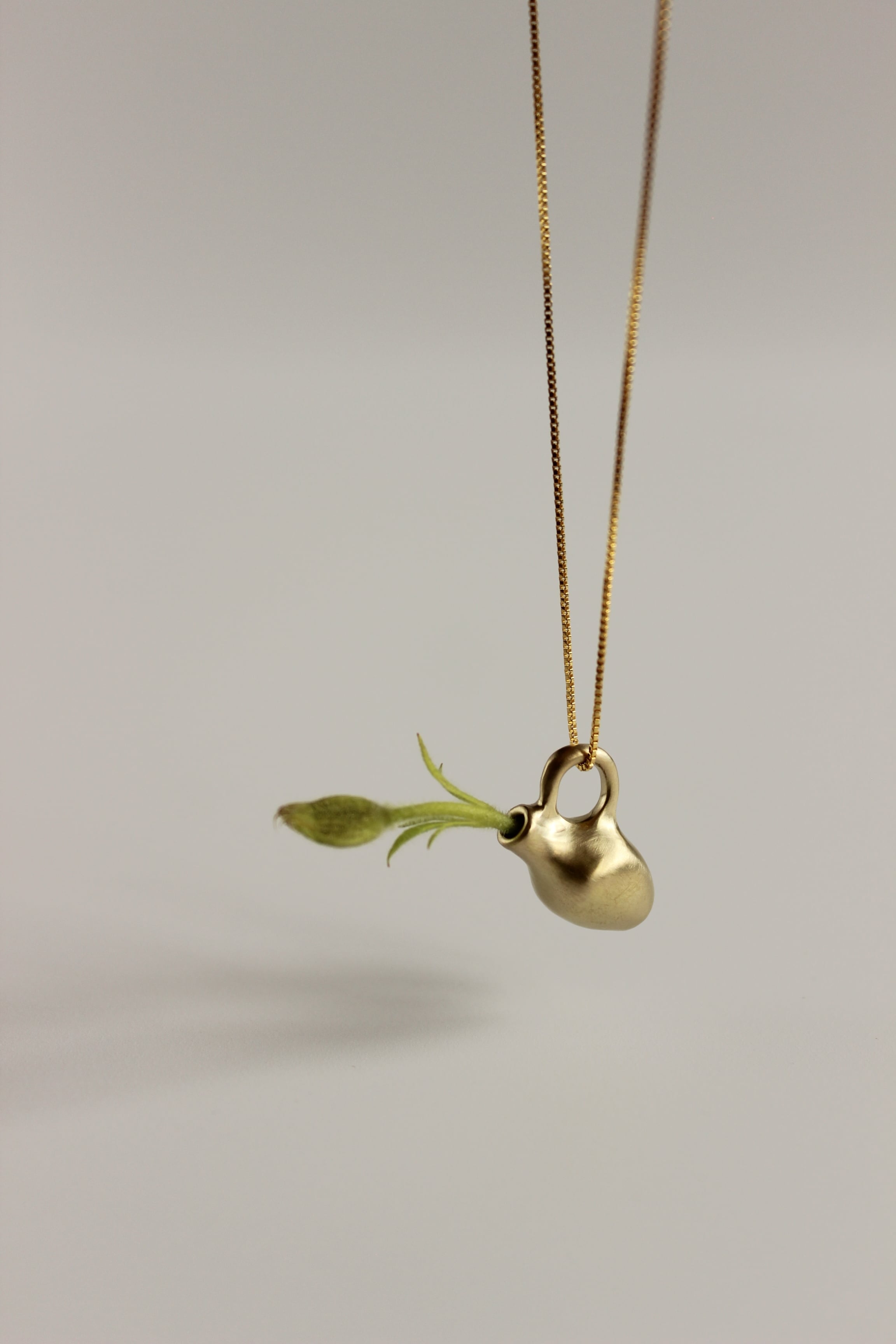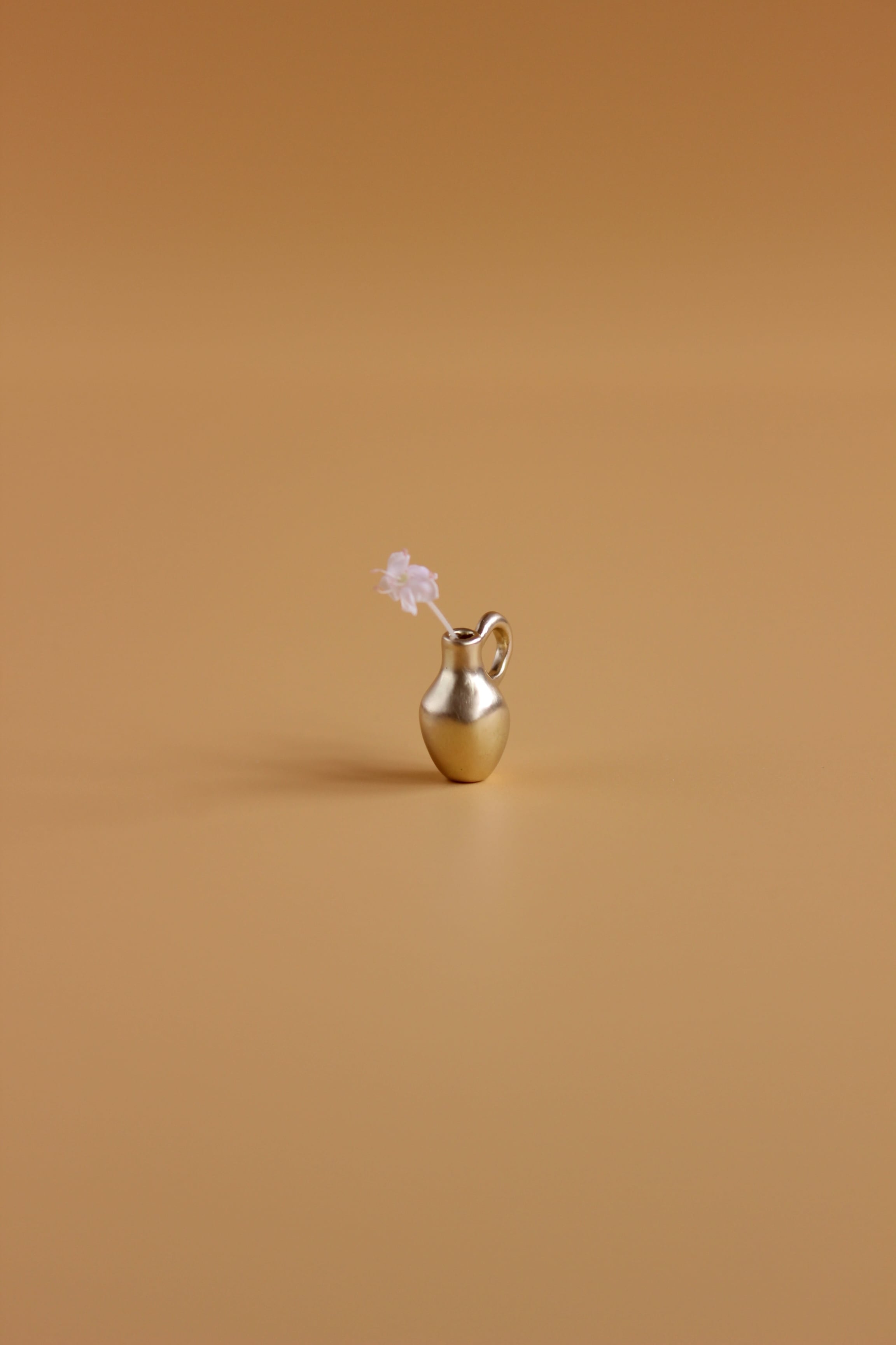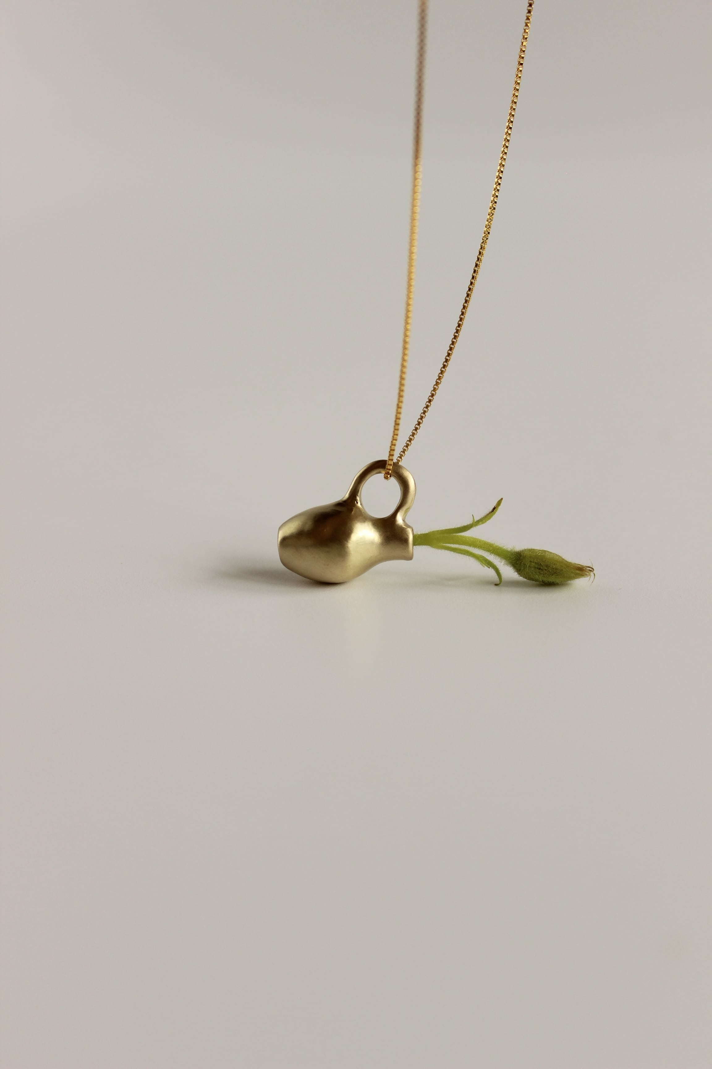 そんな背景の中で今回の Vase pendant シリーズは誕生しました。肩肘を張らず、深呼吸しながら、ふと笑みが溢れてしまうような遊び心もプラスして。実際に小さな草花を生けられるので身につけない時にはミニオブジェとしてお楽しみいただけます。