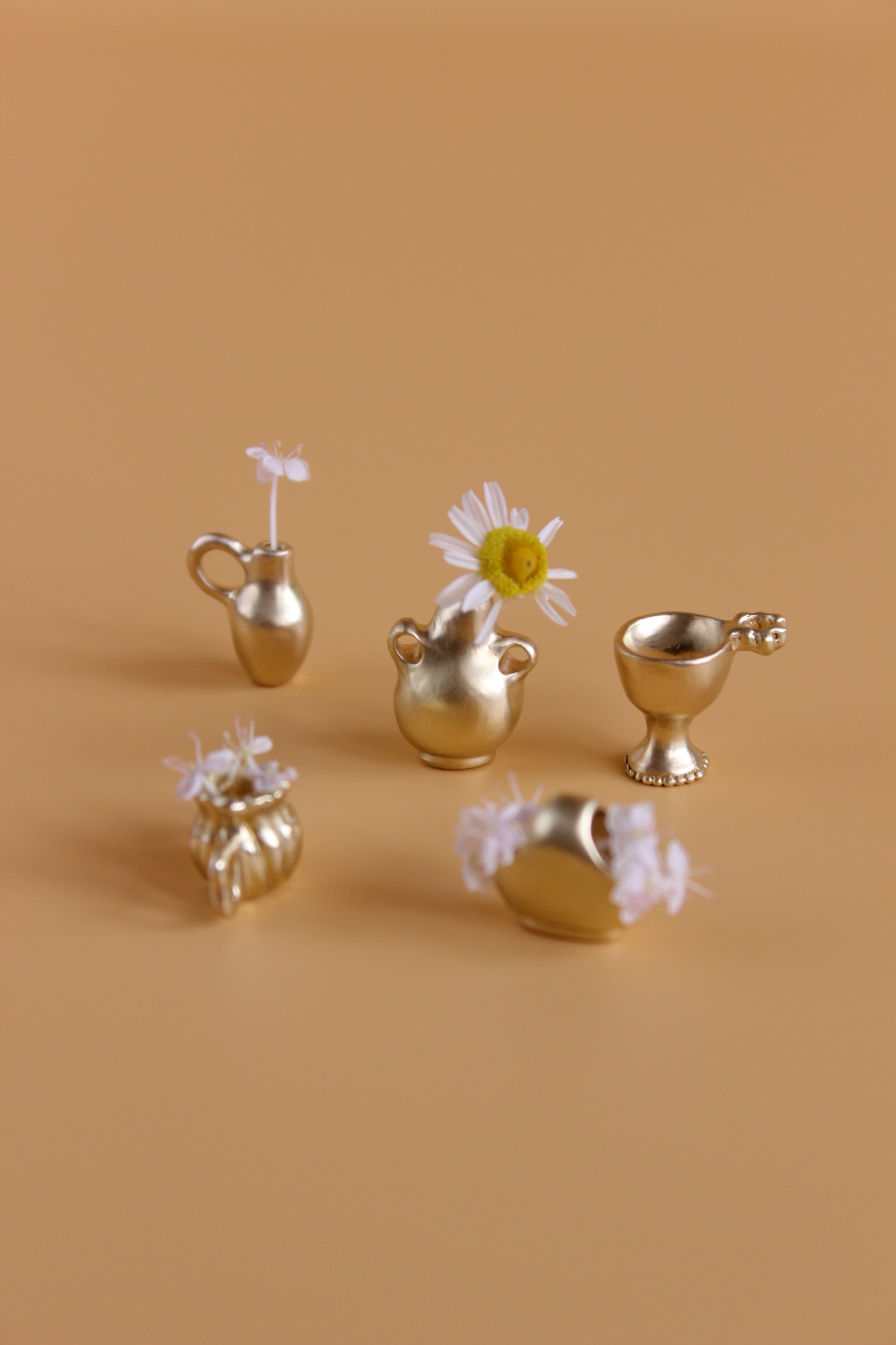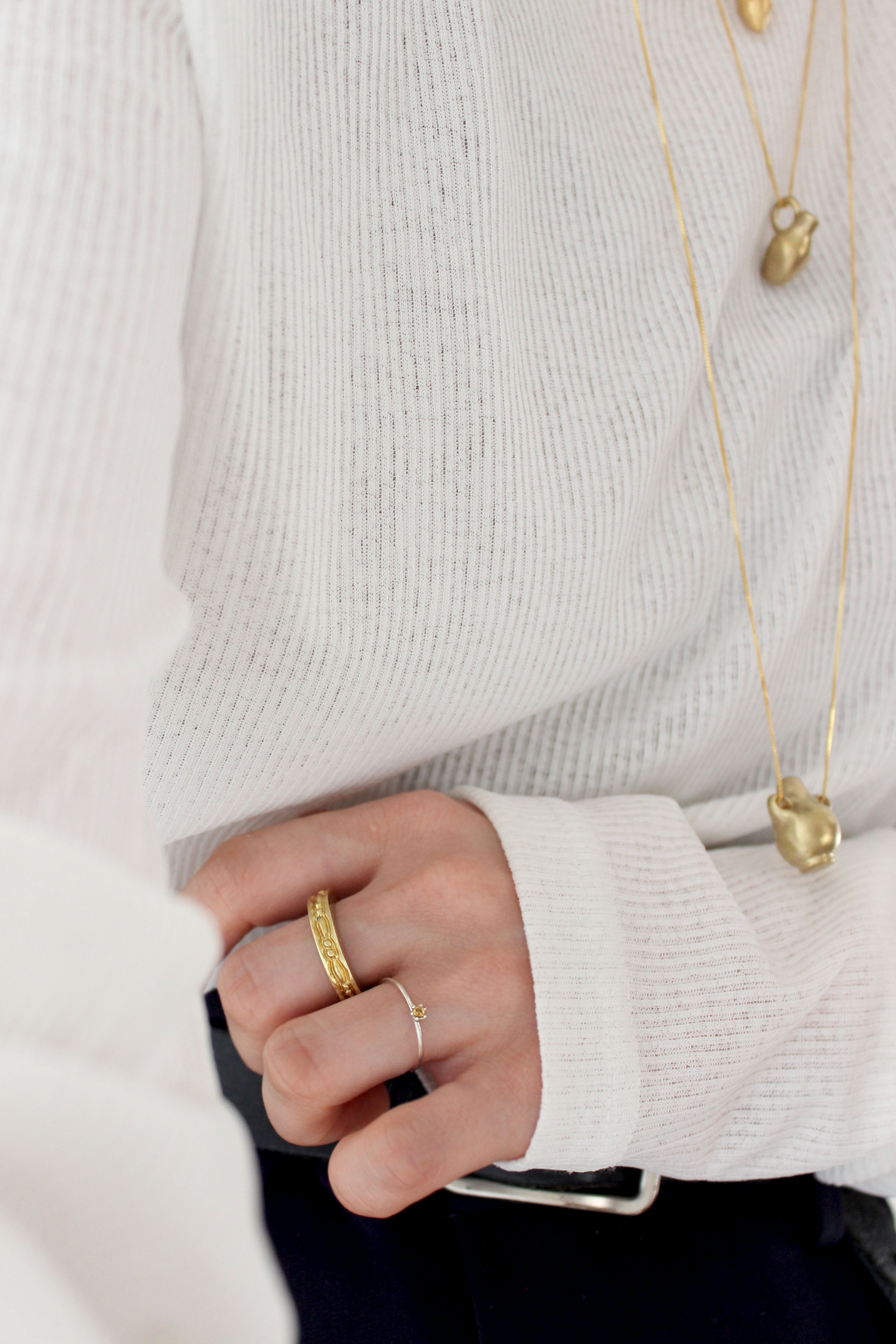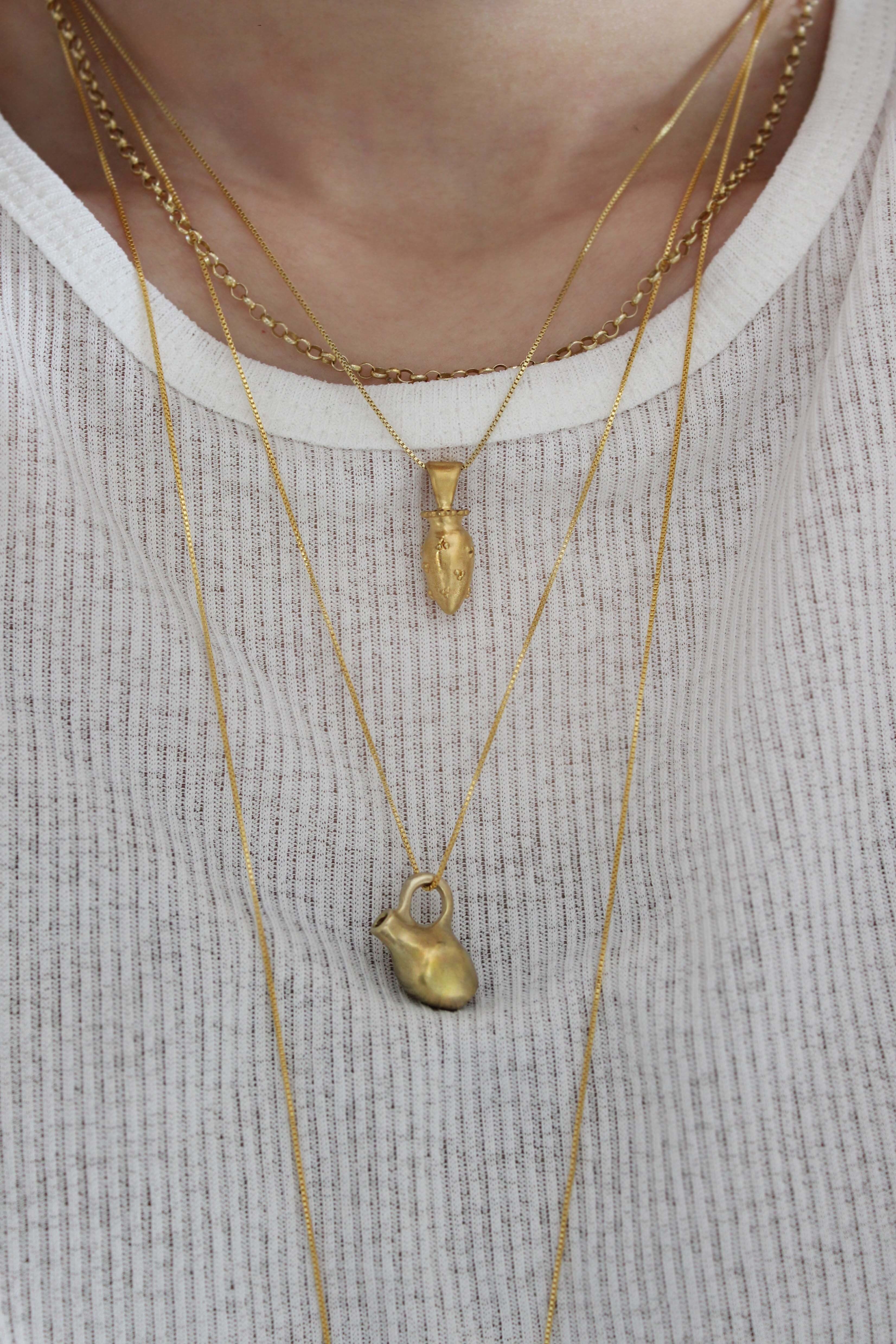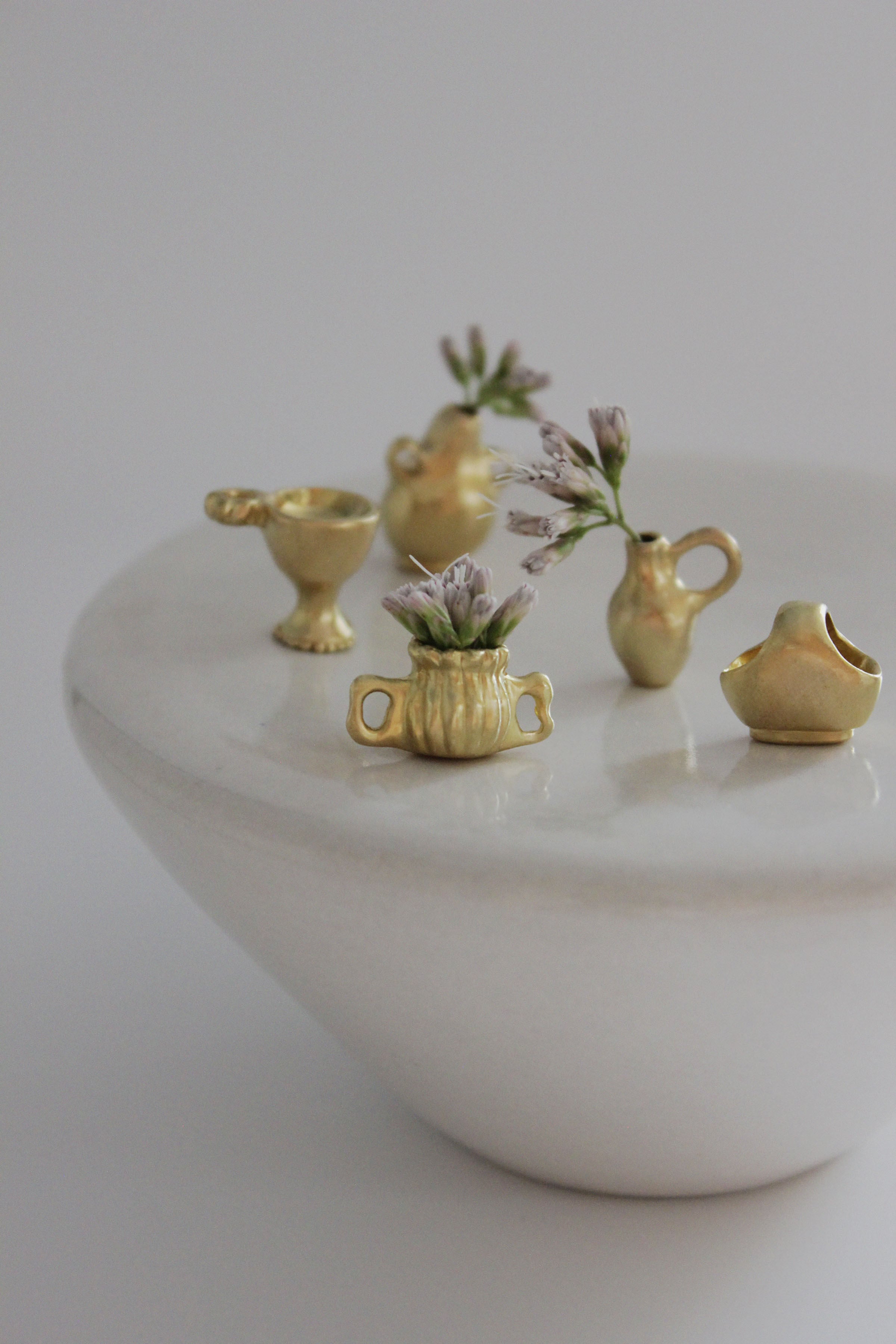 そんな背景の中で今回の Vase pendant シリーズは誕生しました。肩肘を張らず、深呼吸しながら、ふと笑みが溢れてしまうような遊び心もプラスして。実際に小さな草花を生けられるので身につけない時にはミニオブジェとしてお楽しみいただけます。