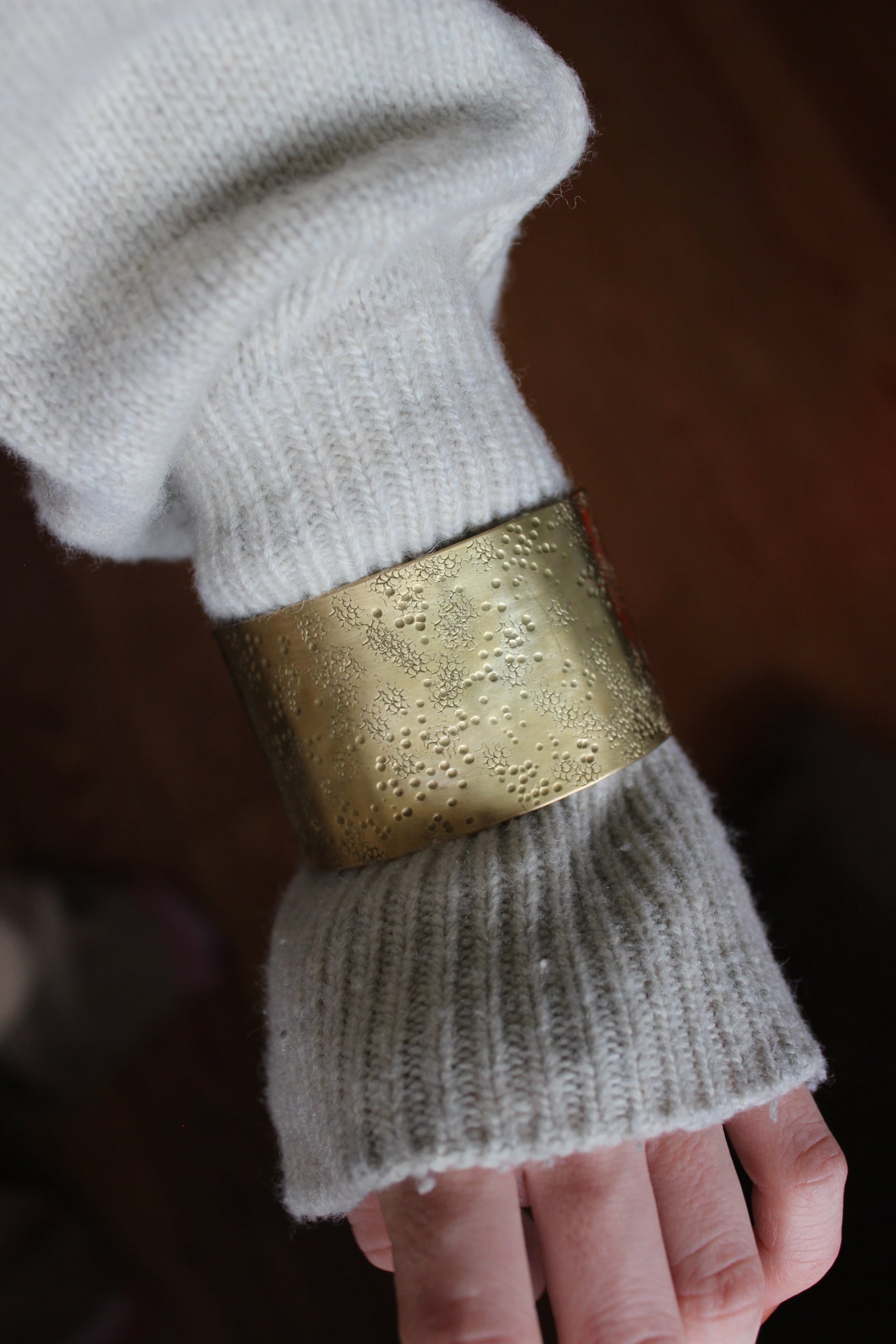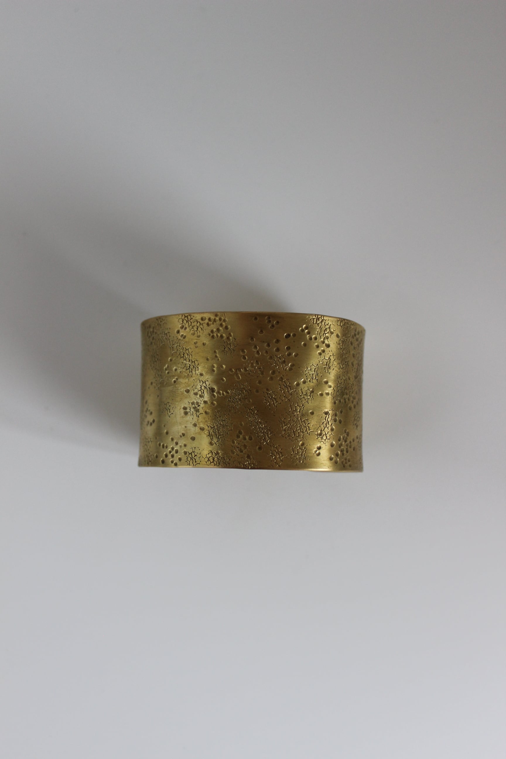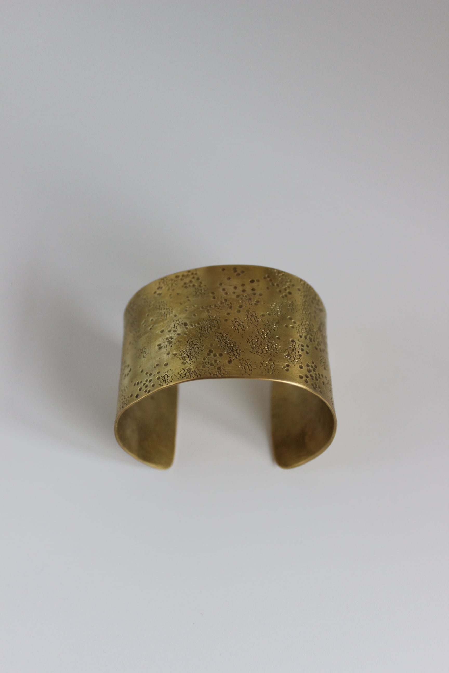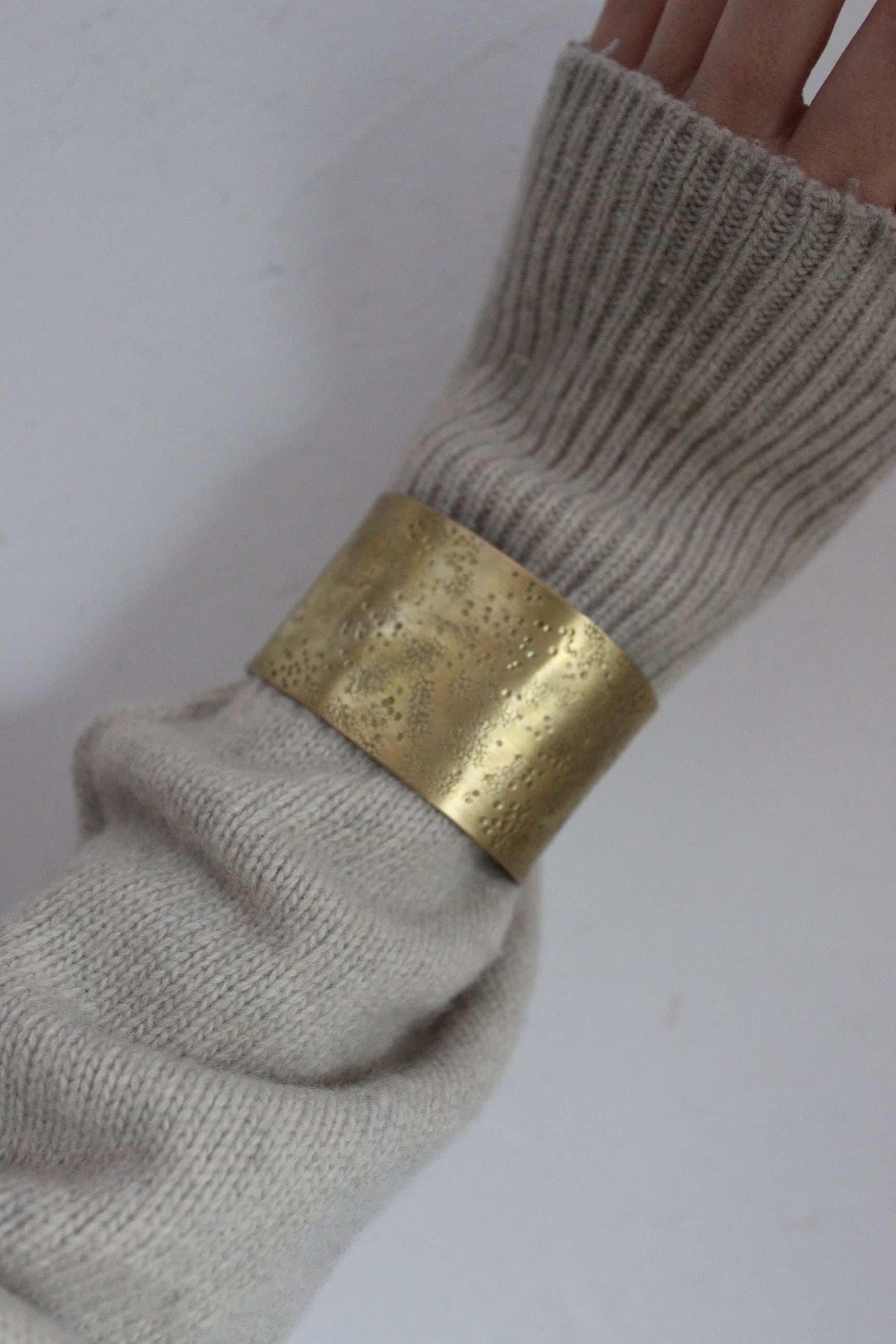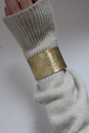 槌目の表情が美しいバングル。 ワイドなのでシンプルな装いにポイントとなってくれます。 今の時期はニットのお袖から被せるようにつけると可愛いです。 スリット部分はご自身の手で調整可能◎ size 内径 5 × 6cm 幅4cm material 真鍮