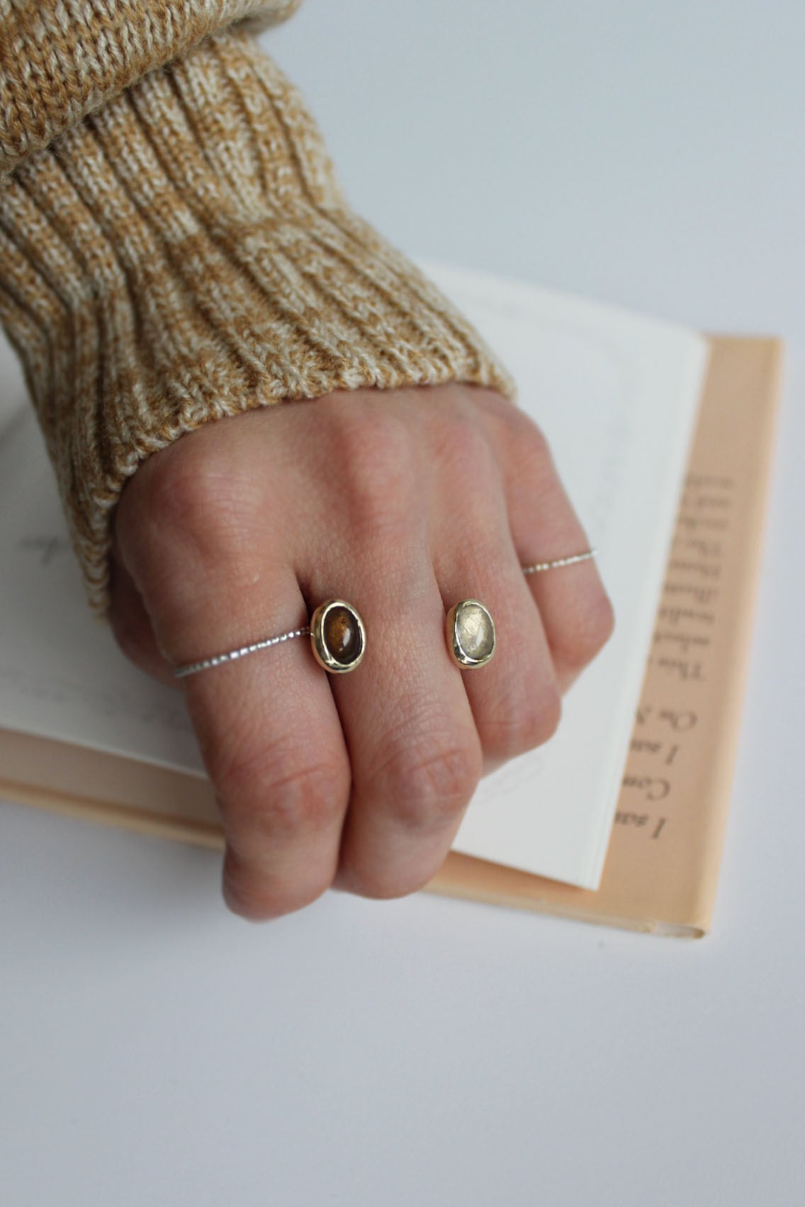 指の間からひょっこり顔を覗かせるようなデザインのストーンリング。