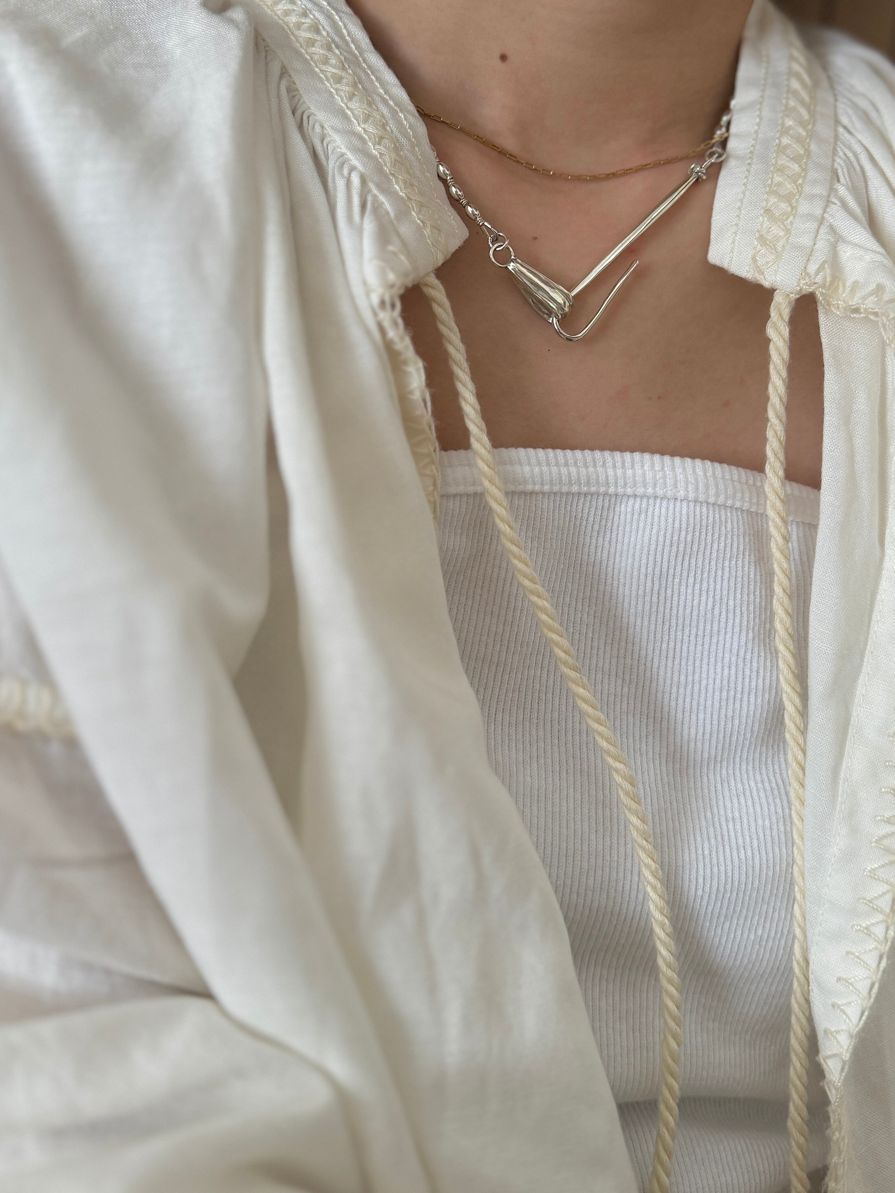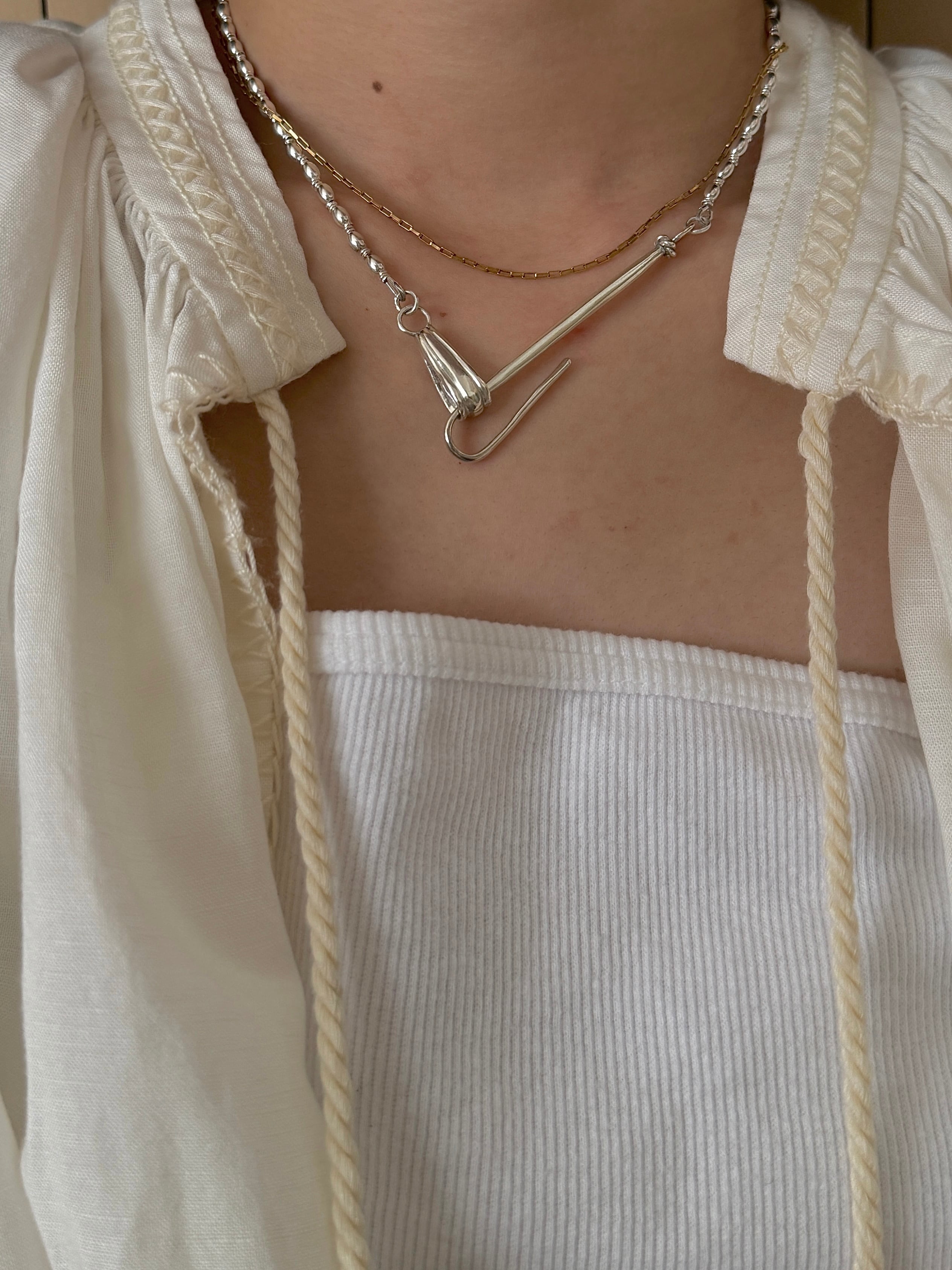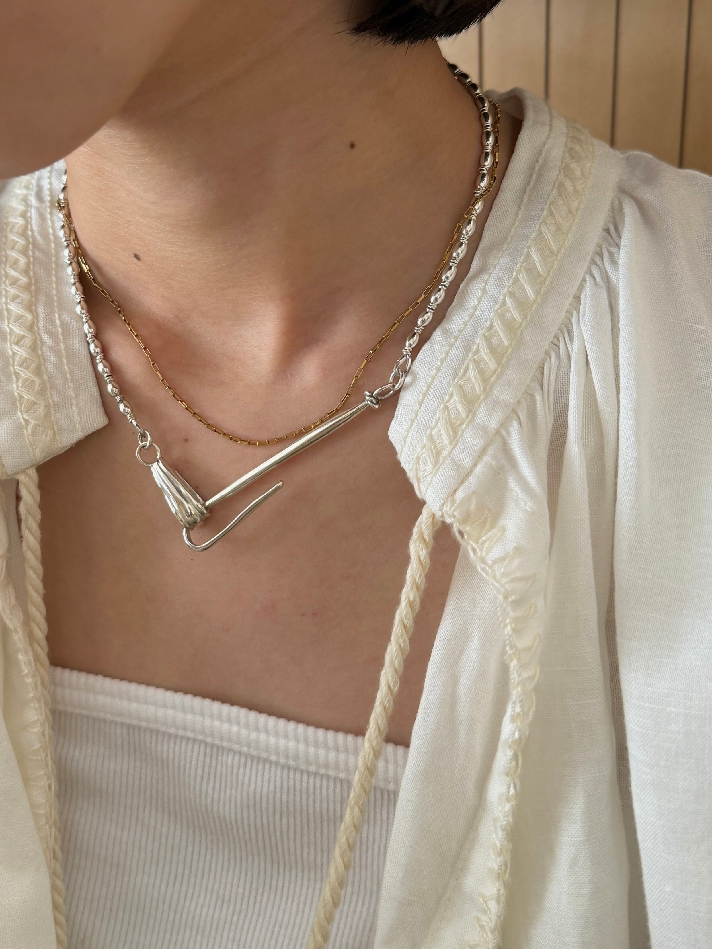 アンティーク家具によく見られるボビンレッグ(糸巻のような足の装飾)からインスパイアされたチョーカーネックレスです。立体感のあるデザインなので首元で程よくポイントとなります。